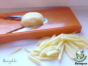 Картофель нарезаем на берноровской тёрке соломкой, отвариваем в кипящей воде 3 минуты, откидываем на дуршлаг, промываем холодной водой, высушиваем на бумажном полотенце.