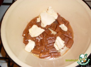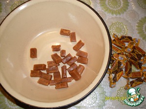 Добавить кефир, соду, растопленные ириски и муку, сколько возьмет, чтобы тесто было как густая сметана.