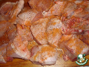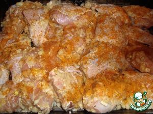 Курицу помыть и нарезать на порционные куски. Посолить, поперчить. Посыпать приправой для курицы и оставляем ее. Готовим маринад.