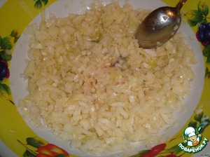 Лук мелко нарезать. Пропустить через пресс чеснок. Добавить масло, уксус и соус. Я добавила еще воды грамм 50.