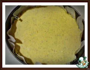 Форму для запекания (26 см) выстелить пекарской бумагой и вылить половину теста.
