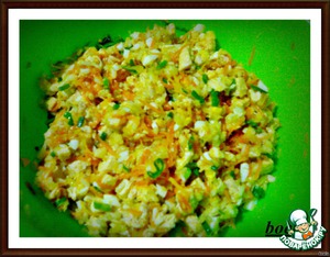 Смешать начинку: курица, рис, яйца, зеленый лук, тушеная морковка с луком.
