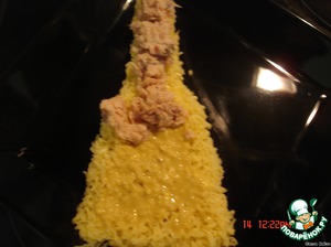 на сыр укладываем рыбку, предварительно помяли вилкой