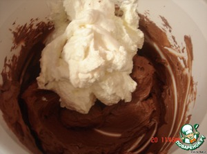 Соединить остывший шоколад с маскарпоне, добавить к сливкам, взбить. -