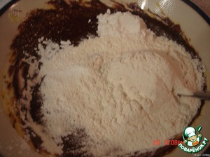 добавить муку 150 гр, разрыхлитель 2 ч.л, хорошо перемешать