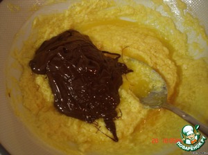 Готовим 2-е тесто: взбить 3 яйца со 150 гр сахара, добавить маргарин, какао, муку 150 гр с содой 1 ч.л.