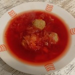 И дополняем кастрюлю доверху. Я обычно беру кипяточек, споласкиваю сковороду, где тушилась свекла (там еще столько цвета остается...) и выливаю в кастрюлю. Добавляю сразу томатную пасту (или замороженные помидоры), специи, уксус, укроп.