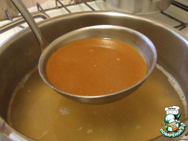 -Наберем немного бульона в половник и растворим бобовую пасту. По вкусу.