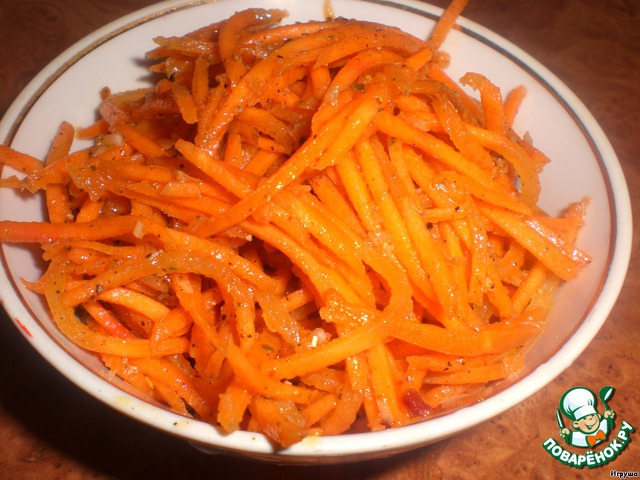 • Морковку и свеклу по-корейски можно купить, а можно приготовить самим (уж очень много рецептов на просторах интернета!). Я готовила сама за день до приготовления салатика. Вот морковка.