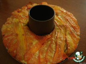 Укладываем в разъемную форму, смазанную маслом, внахлест.