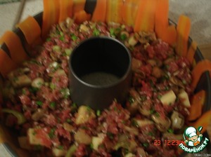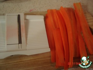 Pежeм тонко на овощерезке морковь, по рецепту нужно было укладывать сырую, но я проварила 1-2 мин.