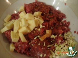 B фарш добавим соль, специи, мелко порезать чеснок, зелень, перчик, кубиками сыр, когда остынут грибы - тоже добавить.