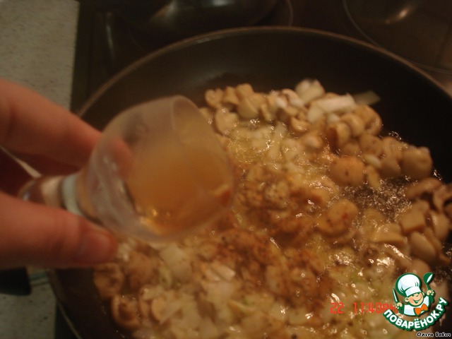 Прожарим грибы с луком, добавляя коньяк, специи, соль, дадим остыть.