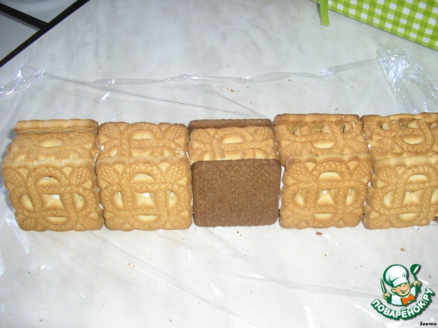 По бокам опять выкладываем творог, и ряд 2/3 печений.