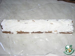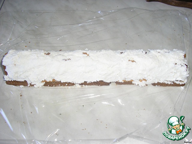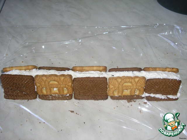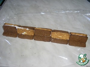 На пищевую плёнку выкладываем 5 целых печений в ряд. Творог смешиваем с сахаром и ванилином (можно взять готовую творожную массу), и выкладываем полосой по центру печений.