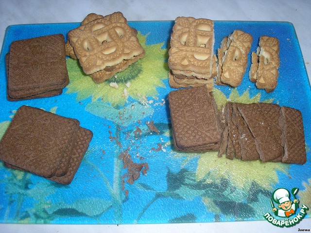 Берём любое печенье, у меня было сахарное и шоколадное. Аккуратно разрезаем ножом на 2/3 и 1/3 10 печений.