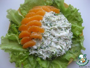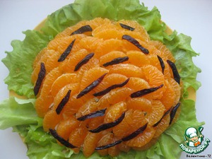 Мандарины очистить и снять с долек всю пленку. Чернослив распарить и нарезать тонкими полосками. На листья салата выложить салат и украсить салат дольками мандарин и полосками чернослива.