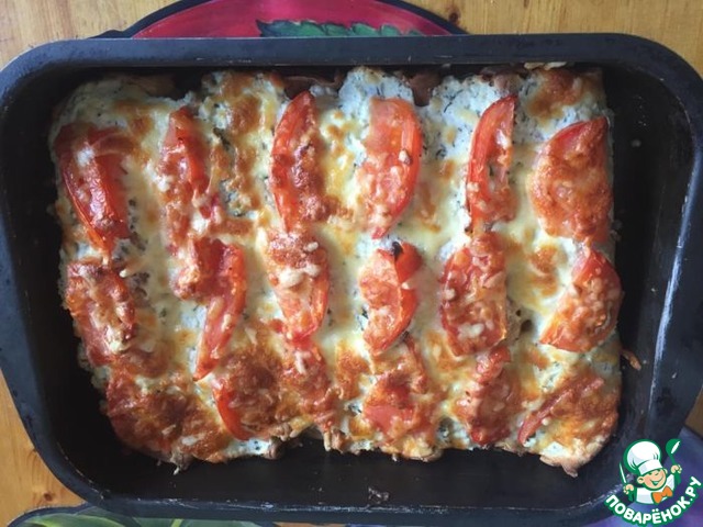 Рулетики выложить в смазанную форму. Сверху - слой творога, затем кружочки помидор.