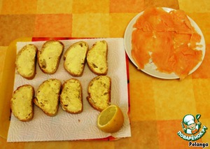 Французский батон нарезать ломтиками и слегка подсушить в тостере.