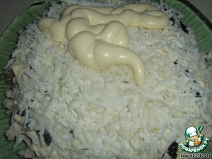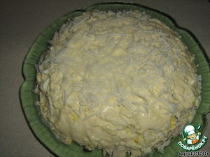 • Теперь покрываем майонезом весь салат, и сверху присыпаем его оставленным сыром.