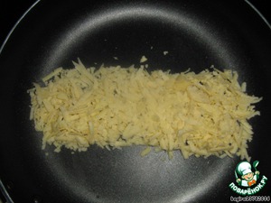• Сыр "Российский" натираем на терке. Кладем часть сыра на сковороду в виде полоски, и ждем, пока она расплавится.