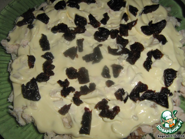 • Чернослив нарезаем на кусочки и выкладываем вторым слоем. Майонезом покрывать не нужно.