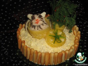 • Ставим на салат подарочную коробку. Оставшуюся грудку(0,5 шт) измельчаем как можно мельче, добавляем чеснок и немного майонеза, чтобы масса слиплась. Часть массы выкладываем в коробку, а из другой стараемся вылепить похожую мордочку и лапки тигренка.