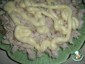 • Теперь собираем салат: отварную куриную грудку(1 шт) измельчаем и укладываем в салатник - это первый слой. Покрываем его майонезом.