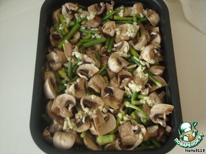 В смазанную сливочным маслом форму выкладываем крупно нарезанные шампиньоны и стрелки чеснока, сбрызгиваем маслом растительным с чесноком.