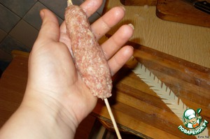 Из фарша формируем продолговатую котлету и нанизываем на деревянную шпажку.