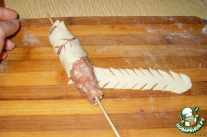 Полоску теста закрепляем с одной стороны шпажки и накручиваем по спирали, закрепляем с другой стороны.