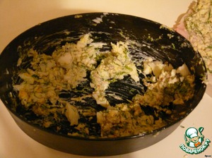 Делаем начинку. Для этого отварное яйцо разминаем вилкой, сыр трем на мелкой терке, добавляем зелень, майонез и перчик по вкусу. Все перемешиваем.