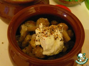 Далее выкладываем в горшочек слоями мясо, соль, гречку, грибочки. Заливаем все водой. Сверху кладем сметанку и смесь перцев. Отправляем в духовку при температуре 200С на 50 минут.