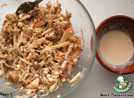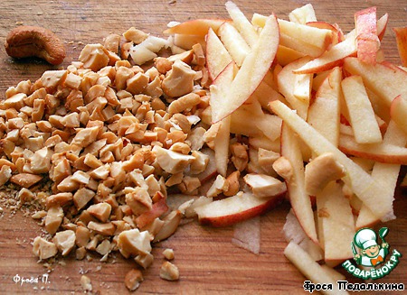 Мелко рубим кешью. Яблоко нарезаем соломкой, сбрызгиваем их лимонным соком.