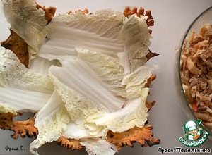 Дно салатницы выстилаем листами пекинской капусты, а лучше зеленым салатом.