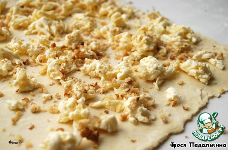 Тесто тонко раскатываем в одном направлении. Половину посыпаем тертым сыром и орехами, накрываем второй половиной и хорошо раскатываем скалкой.