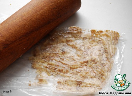 Грецкие орехи кладем в пакет и прокатываем несколько раз скалкой, можно и блендером измельчить.