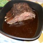 Вот и пришла пора нарезать мясо. В горячем ростбифе режется более жирная сторона…