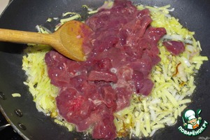 • Добавим печень, нарезанную небольшими кусочками. Обжарим вместе до готовности печени.