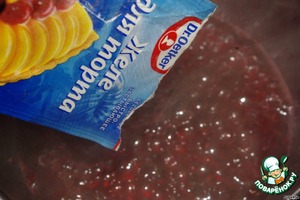 • Добавить желе для торта (как получится с желатином, не могу сказать, так как у этого желе получается довольно мягкая консистенция и его можно легко намазать куда угодно, что мне и нужно было).