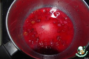 • Приготовим желе. Для этого нужно растереть клюкву с сахаром, добавить немного воды. Сварить сироп.