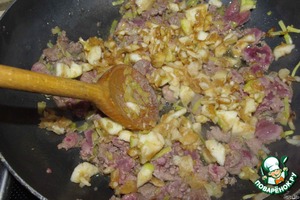 • Добавляем мелко нарезанные яблоки. Тушим вместе, добавив по вкусу соль, перец и либо уксус, либо сахар - тут на Ваше усмотрение, смотря какие яблоки, нужно попробовать..