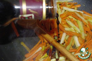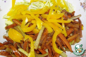 Добавляем остуженную морковь с сельдереем, нарезанный перец.