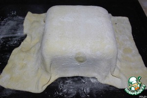 На противень ставим любую форму (жаропрочную), смазываем немного маслом, кладём сверху тесто. Лишнее отрезаем. -