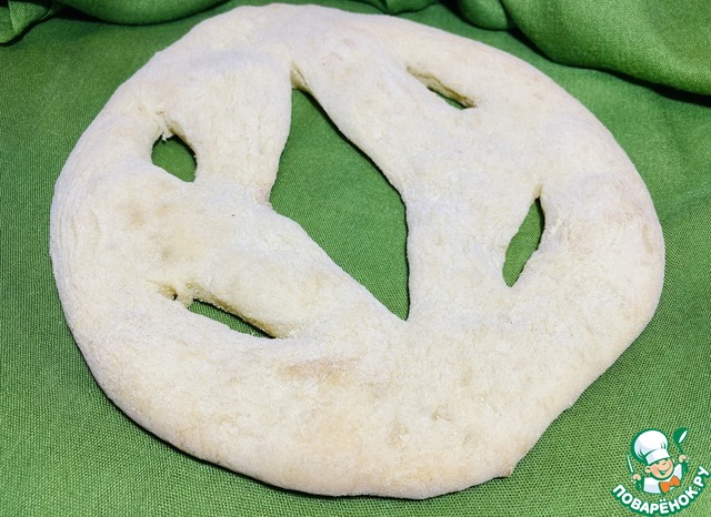 Прорезаем лепешку острым ножом и раздвигаем разрезы. Не мельчите — пяти дырок хватит, а мелкие разрезики слипнутся при выпечке. Делаем один длинный разрез по центру и еще по два по бокам.