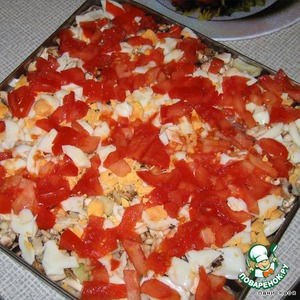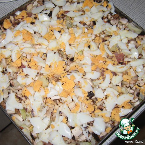 Шампиньоны режем мелкими кубиками, они - следующий слой