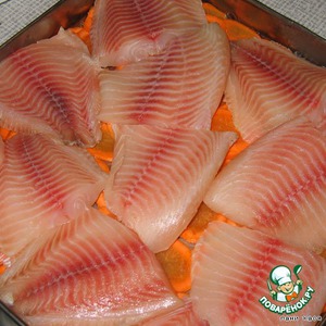 На морковную подушку выкладываем рыбу (я разрезала каждое филе пополам), солим, приправляем перцем или специями к рыбе (я не люблю, вкус резковат имхо)