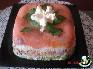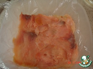 Форму застелить пищевой пленкой, выложить пластинами рыбки