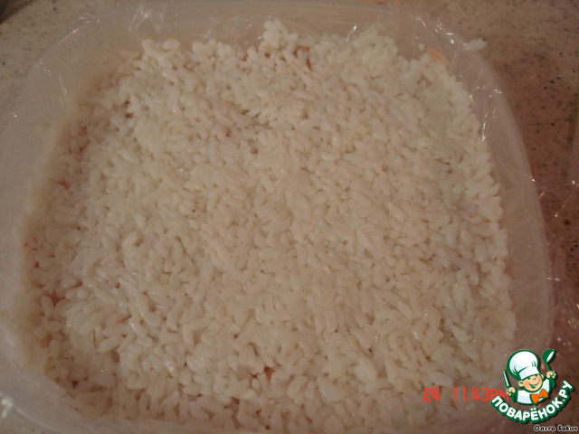 Сверху укладываем вареный рис, хорошо прижимая (оставляем немного риса)
