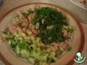 Нарезать зелень, мелко - огурчик, если креветки крупные, их нарезать мельче